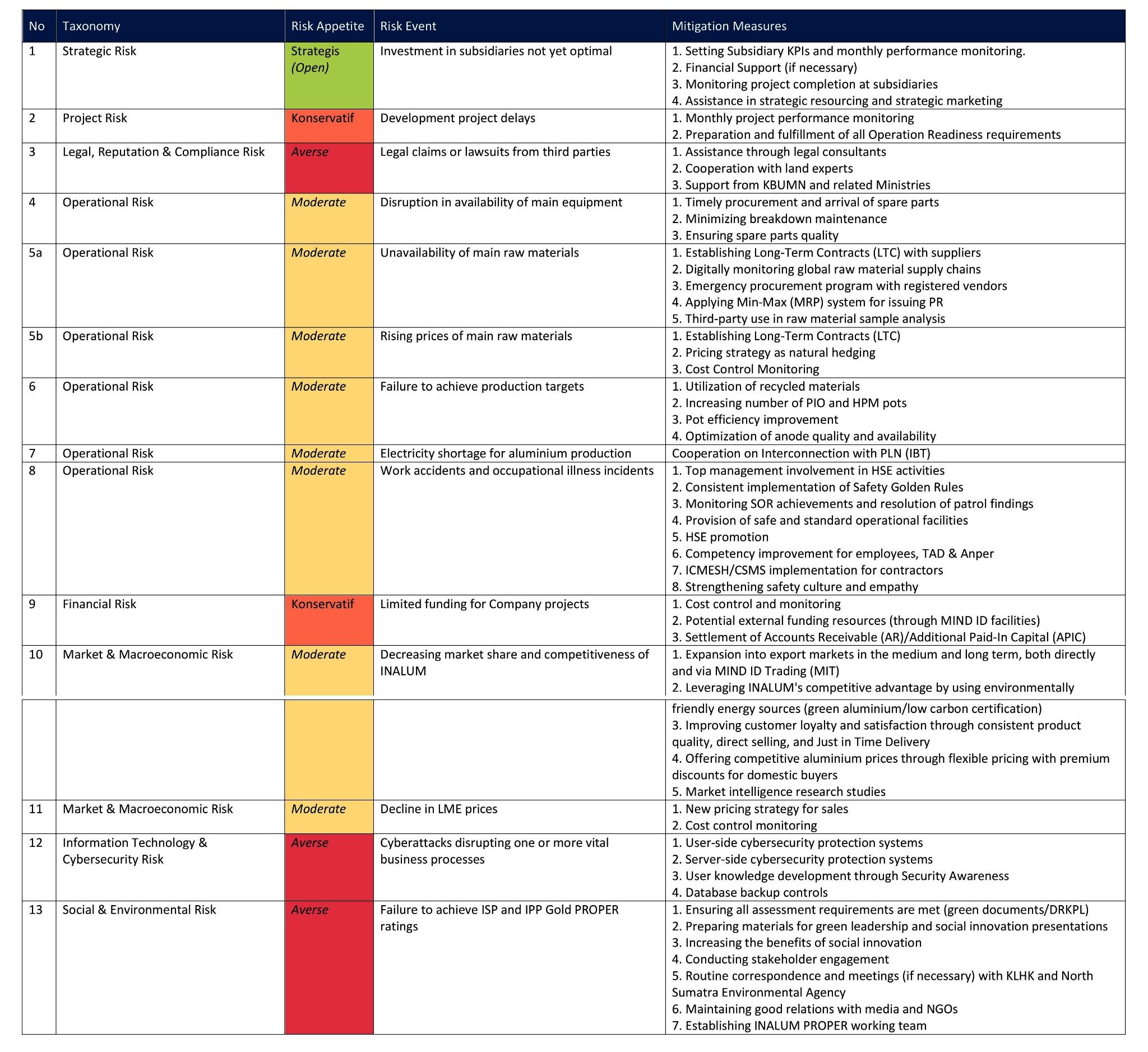 Based on this identification and determination process, INALUM’s Top Risks have been categorized according to the MIND ID risk taxonomy as follows: