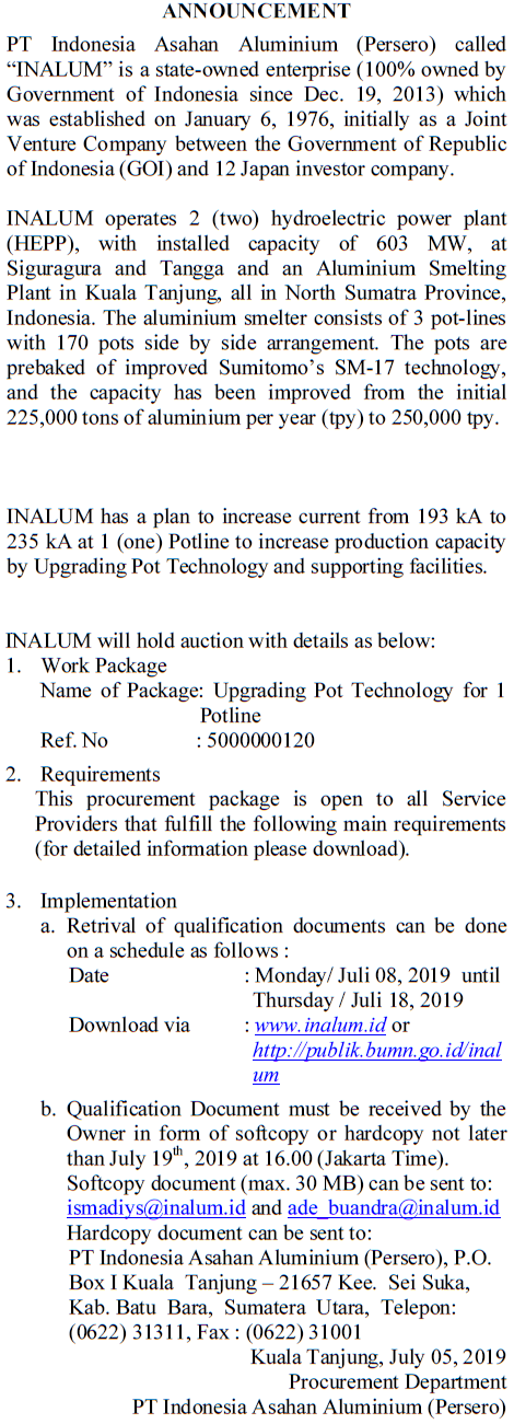Auction Announcement of Upgrading Pot Technology for Potline No. 1