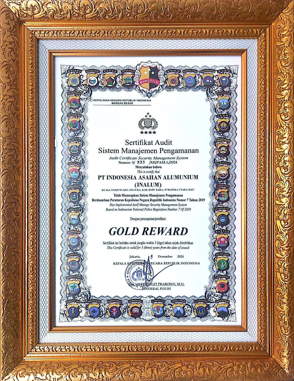 - Sistem Manajemen K3 dari Kementerian Ketenagakerjaan sesuai Permenaker no. 5 tahun 1996 sejak 3 Januari 2025 dan saat ini memegang sertifikasi Sistem Manajemen K3 sesuai dengan Peraturan Pemerintah no. 50 tahun 2012 (sertifikat no, REG.SMK3.2023.SUC.SK-1537) pada 09 Juni 2023 dengan lingkup sertifikasi mencakup Peleburan dan Pencetakan Aluminium yang berlaku hingga 9 Juni 2026.